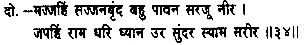 Numerous companies of pious men bathe in the holy stream of the Saryu and, meditating in their hearts on the beautiful swarthy form of Rama, repeat his name.