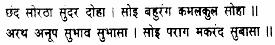 The other metres, viz., Chhandas, Sorathas and Dohas, gleam like a cluster of charming many-coloured lotuses. The incomparable sense, the lofty ideas and the elegance of expression represent their pollen, honey and fragrance.