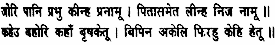 Greeting her with folded hands, the Lord told her his name and the name of his father. He then asked her the whereabouts of Shiva (who has a bull emblazoned on his banner) and wondered what made her roam about all alone in the forest.