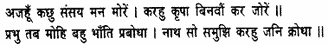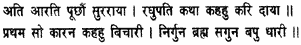I ask you, O king of heavens, with a heart sore distressed; be gracious enough to tell me the story of Raghunatha. First, consider and tell me the cause why the unqualified Brahma assumes a qualified form (i.e., why the impersonal Absolute becomes personal).