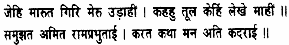 Tell me, of what account is a flock of cotton in the storm-wind before whose blast Mount Meru flies through the air? When I think of Rama’s infinite majesty, I hesitate, afraid to tell this story.