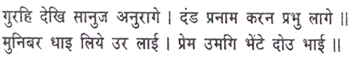 On seeing the guru, both the Lord and his younger brother (Lakshmana) were overwhelmed with affection and fell prostrate before him, but the great sage ran and clasped them to his bosom and rapturously greeted them.