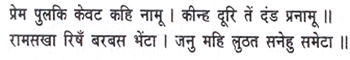 Trembling with emotion and giving his name, the boatman too prostrated himself at a respectable distance, but the sage forcibly embraced him as Rama’s friend, as though he had gathered up Love rolling about on the ground.