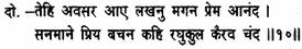 Then at that moment came Lakshmana, full of love and delight, and was welcomed with words of affection by the moon of the lily-like of Raghu.