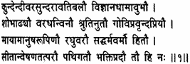 May the two noble scions of the house of Raghu, beautiful as the jasmine and the dark-blue lotus, both of surpassing sturdiness, repositories of all wisdom, endowed with natural grace, accomplished archers, hymned by the Vedas, dear to (or lovers of) cows and Brahmans, who by illusory power have appeared in the form of mortal men, protectors of righteousness, beneficent, wayfarers intent on their search for Sita – may they grant me devotion!