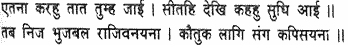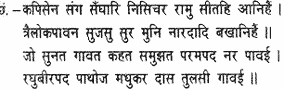 Taking with him his army of monkeys, Rama will exterminate the demons and bring back Sita; and the gods and Narada and the other sages will hymn his praises that sanctify th three spheres. Whoever hears, hymns, recites or meditates upon this glory attains to the supreme state – the glory sung by Tulasidasa, who is devoted like a bee to the lotus feet of Raghubira.