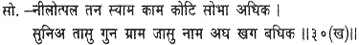 Listen, then, to the praises of Rama, who possesses a form dark as the dark-blue lotus, more beautiful than a myriad Cupids, and whose name is a fowler who sweeps into his net the birds of sin.