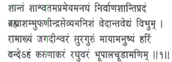 Him I adore, the passionless, the eternal, beyond the ordinary means of cognition, the sinless; the bestower of the peace of final liberation; who is continually worshipped by Brahma (the Creator), Shambhu (Lord Shiva) and Shesha (the Serpent King); knowable by the Vedanta, omnipresent, the sovereign of the world, the preceptor of the gods, Hari himself in the delusive form of man; the mine of compassion, the chief of the house of Raghu, the jewel of kings, whose name is Rama!
