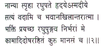 O Raghupati, I declare in truth, and you, too, know the inmost secrets of all, that there is no other craving in my heart but that you should grant me perfect devotion, O crest-jewel of the Raghu house, and make my heart clean of lust and every other sin!
