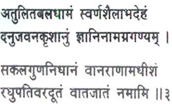 I make obeisance to the Son of the Wind, the home of immeasurable strength, possessing a body shining like a mountain of gold (Sumeru), a fire to consume the forest of the demon race, the foremost among the wise, storehouse of every excellence, the chief of the monkeys, Raghupati’s noble messenger!