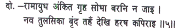 Emblazoned with Rama’s weapons, the mansion was beautiful beyond words. The monkey chief rejoiced to see clusters of fresh tulasi plants there.