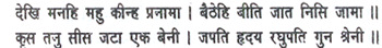 As soon as he saw her, he made mental obeisance and observed that she had been sitting the whole night through, emaciated in body, her hair knotted up in a single braid on her head, and was repeating to herself the host of Rama’s excellences