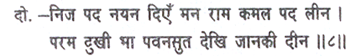 With her eyes fixed on her own feet, she was mentally absorbed in the contemplation of Rama’s lotus feet. Hanuman, the Son of the Wind, was mightily distressed to see Sita so stricken with grief.