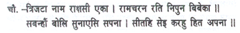 One of these female demons, Trijata by name, was devoted to Rama’s feet and perfect in spiritual wisdom. She summoned all her companions and told them of a dream and exhorted them to serve Sita and bless themselves.