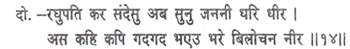 Now, mother, compose yourself and hear Raghunatha’s message.’ Even as he uttered these words, the monkey’s voice failed him and his eyes filled with tears.