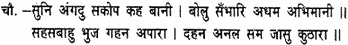 ‘Listen, you fool! I am the same mighty Ravana, the might of whose arms is known to Kailasa (the peak sacred to Shiva) and whose valour to Uma’s lord, in whose worship I offered my heads in place of flowers.