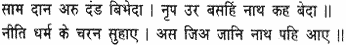 - viz., sama (conciliation), dana (gift), danda (physical force or coercion) and bheda (division), which dwell in the heart of a king, so declare the Vedas, my Lord; they are the noble pedestals on which kingly polity and religion stand; realizing this, they came to themselves to my Lord (who is a true repository of all statesmanlike virtues).