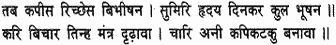 Then the Monkey King (Sugriva) and the king of the bears (Jambavan) and Vibhishana, with their thoughts fixed on the jewel of the Solar race, took counsel together and resolved upon a definite plan. They divided the monkey host into four companies