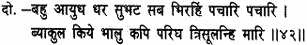 Armed with many a weapon, all the warriors pressed forward to the fray, challenging the foe again and again. Smiting the bears and monkeys with iron bludgeons and tridents, they sorely discomfited them.