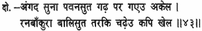 When Angad heard that Hanuman had made his way into the fort alone, the son of Bali, that doughty warrior, reached the fort in a single bound as a monkey would do in sport.