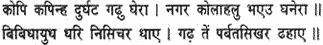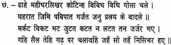 The demons hurled down myriads of mountain peaks and fired missiles of every description, which came loud-roaring like a bolt from heaven, and the warriors thundered like clouds on the day of dissolution. The formidable monkey champions clashed with the foe and were hacked to pieces, but they yielded no ground to the enemy though their bodies were riddled with wounds. They seized rocks and hurled them at the fort and the demons fell to them where they stood.