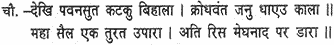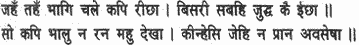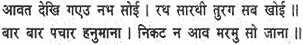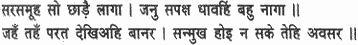 When Hanuman saw that his army was in distress, he was frantic with rage and rushed forth as if he were death personified; quickly tearing up an enormous mountain rock, he hurled it at Meghanada, his spirits swelling in rising wrath.