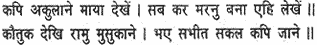 The monkeys were greatly upset at the sight of this illusion and thought, ‘If things went on like this, we must all of us perish.’ Rama smiled when he saw this fun; at the same time he realized that the monkeys were all alarmed.