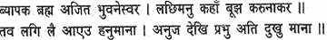The all-pervading and invincible Lord of the universe, the all-merciful Supreme Spirit, asked: ‘Where is Lakshmana?’ Meanwhile, Hanuman brought him in; seeing his younger brother (in a swoon), Rama felt sore distressed.