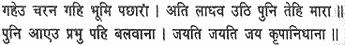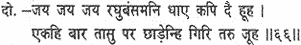 Raising a shout of ‘Glory, glory, all glory to the jewel of the house of Raghu!’ the monkeys rushed forward and rained upon him all at once a hall of mountains and trees.
