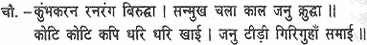Maddened with the lust of battle, Kumbhakarna marched against the enemy like Doom himself furious with rage. Myriads of monkeys he seized one after another and devoured them like swarms of locusts entering a mountain cave.