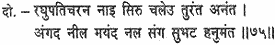 Bowing his head at the feet of Raghunatha, Lakshmana darted forth at once, accompanied by stalwarts like Angad, Nila, Mayand, Nala and valiant Hanuman.