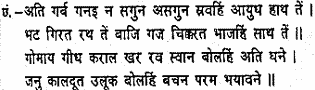 In his overweening pride he took no heed of the omens, good or bad. Weapons dropped from the hands and warriors fell from the chariots, while horses neighed and elephants trumpeted as they ran out of the battle-line; jackals, vultures and donkeys gave a shrill cry, while huge packs of dogs made a frightful clamour, and owls, like harbingers of doom, hooted weirdly.