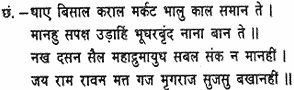 With a shout of “Victory! Victory” on both sides and each finding his own match, the heroes closed in combat, the monkeys singing the glory of Rama and the demons extolling Ravana.