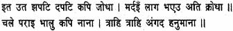 Then swooping down on the enemy and bounding on this side and on that, he began to crush the monkey warriors in the fierceness of his wrath. Many a bear and monkey took to flight, crying, ‘Save us, save us, Angad, Hanuman!