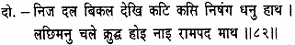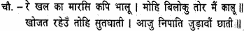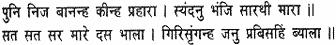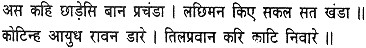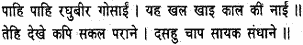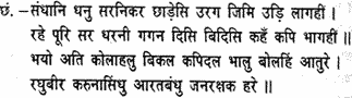 Fitting an arrow to each of his bows, he shot forth a volley of shafts, which flew on and struck them like winged serpents. Heaven and earth and all the eight quarters were filled with arrows, so that the monkeys knew not where to go. There was a terrible uproar in the ranks of the monkeys and bears, who cried in dismay; ‘O Raghubira, ocean of compassion! Befriender of the distressed! O Hari, saviour of the faithful!’