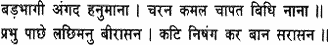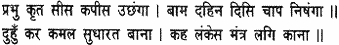 The blessed Angad and Hanuman rubbed and pressed his lotus feet, while behind the Lord sat Lakshana in the warrior posture, with the quiver fastened at his side and bow and arrows ready in his hands.