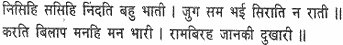 Reproaching the night and the moon in so many ways, she said, ‘The night has assumed the length of an age and is never-ending.’ Disconsolate at her separation from Rama, Janaki made sore lamentation within herself.