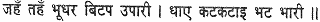 The charioteer clasped Ravana’s feet and endeavoured to soothe his anger. At daybreak Ravana mounted his car and sallied forth again. When they heard of Ravana’s approach, the monkey ranks were wildly agitated.