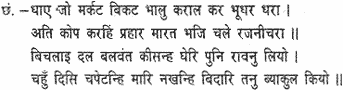 The fierce monkeys and formidable bears rushed on with mountains in their hands, which they hurled forth with the utmost fury. The demons, who were unable to resist the onslaught, took to their heels. Having thus humbled the enemy ranks into the dust, the valiant monkeys then closed around Ravana, and buffering him on every side and tearing his body with their claws, utterly discomfited him.