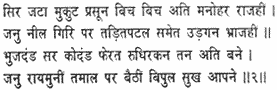 The crown of knotted hair on Rama’s head, intertwined with blossoms of surpassing loveliness, gleamed like flashes of lightning on the star-lit peaks of a dark mountain. As he stood twirling his bow and arrows between his arms, drops of blood adorned his person, like a flock of rayamunis joyously perched on a tamala tree.