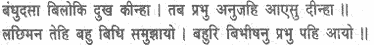 He was sorely pained to see his brother’s condition. The Lord thereupon gave an order to his younger brother, Lakshmana, who did all he could to console him with kindly words. Then Vibhishana returned to the Lord.