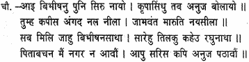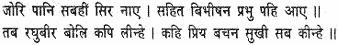 and with folded hands bowed their heads before him. Then with Vibhishana they rejoiced the Lord. Raghubira next called the monkeys together and gratified them all with gracious words.