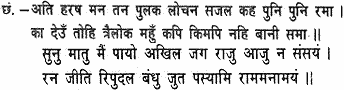 Her heart was overjoyed, the hair of her body bristled with delight and with eyes full of tears she said again and again, ‘What can I give you, Hanuman? There is nothing in all the three worlds to be compared to your tidings.’ ‘Listen, mother,’ Hanuman replied, ‘assuredly today I have attained the sovereignty of the whole world when I behold the unblemished Rama and his brother triumphant over the ranks of the enemy.’