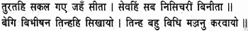 Forthwith they went to the spot where Sita was and found all the demon ladies waiting on her in all humility. Promptly Vibhishana gave them their instructions, and they attended her to the bath with all formality;