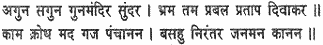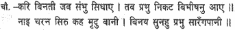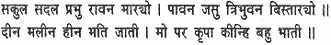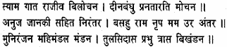 O Rama, dark-hued and lotus-eyed, friend of the humble, reliever of the sorrows of the suppliant, do you, O king, with Janaki and your brother, take up your abode ever in my heart! You gladden the sages and adorn the round globe, O lord of Tulasidasa, destroyer of dread!