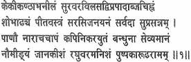 I ever worship Rama, the adorable lord of Janaki, the noblest of the sons of Raghu, mounted on Pushpaka, dark as the dark-blue sheen of a peacock’s neck, the highest of the immortals, adorned with the print of the Brahman’s (Bhrigu’s) louts foot, rich in splendour, clad in yellow robes, louts eyed, ever propitious, holding a bow and arrows in his hands, attended by a host of monkeys and served by his brother (Lakshmana).