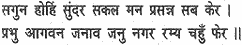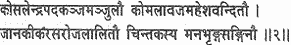 Beautiful and tender are the lotus feet of Rama, the lord of Ayodhya, worshipped by Brahma and Shiva, fondled the lotus hands of Janaki and haunted by the bee-like souls of the contemplatives. (May the bee of my soul be similarly absorbed in the lotus feet of the Lord!)