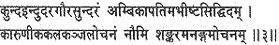 I worship the all-merciful Shankara, beautiful and white as the jasmine or the moon or the conch, with eyes resembling a lovely lotus, lord of Parvati, granter of all the heart desires and deliverer from the power of Love.