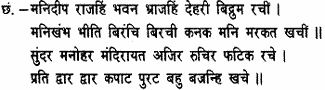 In the mansions shone jewelled lamps, and their thresholds glittering with coral paving. The pillars of jewels and walls of gold inlaid with emeralds were such as the Creator (Brahma) himself might have fashioned. Beautiful, charming and spacious as the palaces were, they had their courtyards inworked with crystal, and every gateway was fitted with folding doors of gold embossed with diamonds.