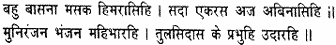 and slays the swarm of manifold sensual desires as frost kills a swarm of mosquitoes; who is ever unchangeable, unborn and imperishable, the delight of the sages, the reliever of the earth’s burdens, the munificent Lord of Tulasidasa?’